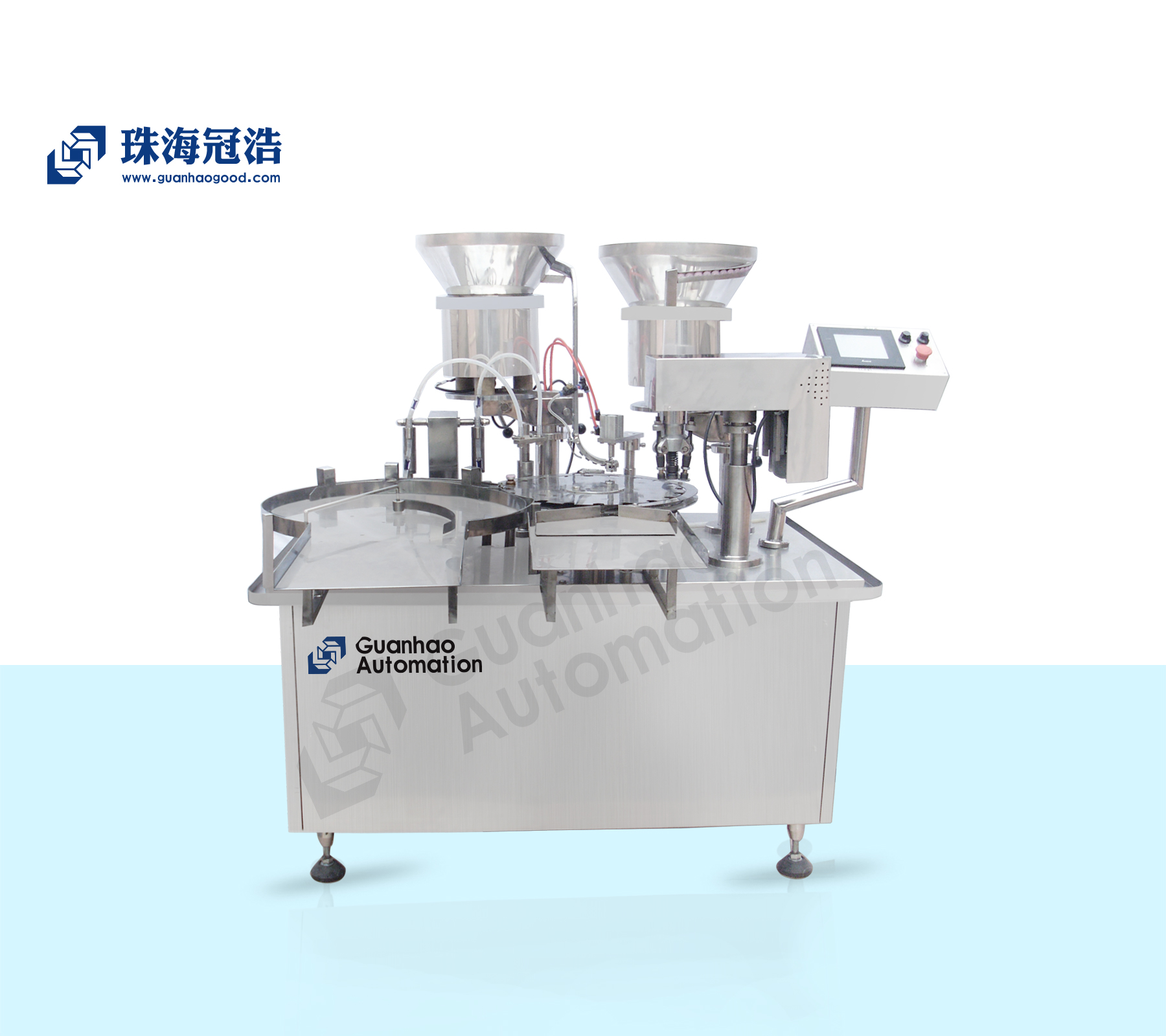 珠海市冠浩机械设备有限公司- 本机产西林瓶液体灌装、上塞、上盖、轧盖生产线中的主机,能自动完成进瓶、灌装、上塞、上盖、轧塞和出瓶等动作,采用计量泵灌装工艺,计量精确。电磁振荡送塞、送盖,三刀离心轧盖。本机结构简单,操作方便,符合GMP要求。