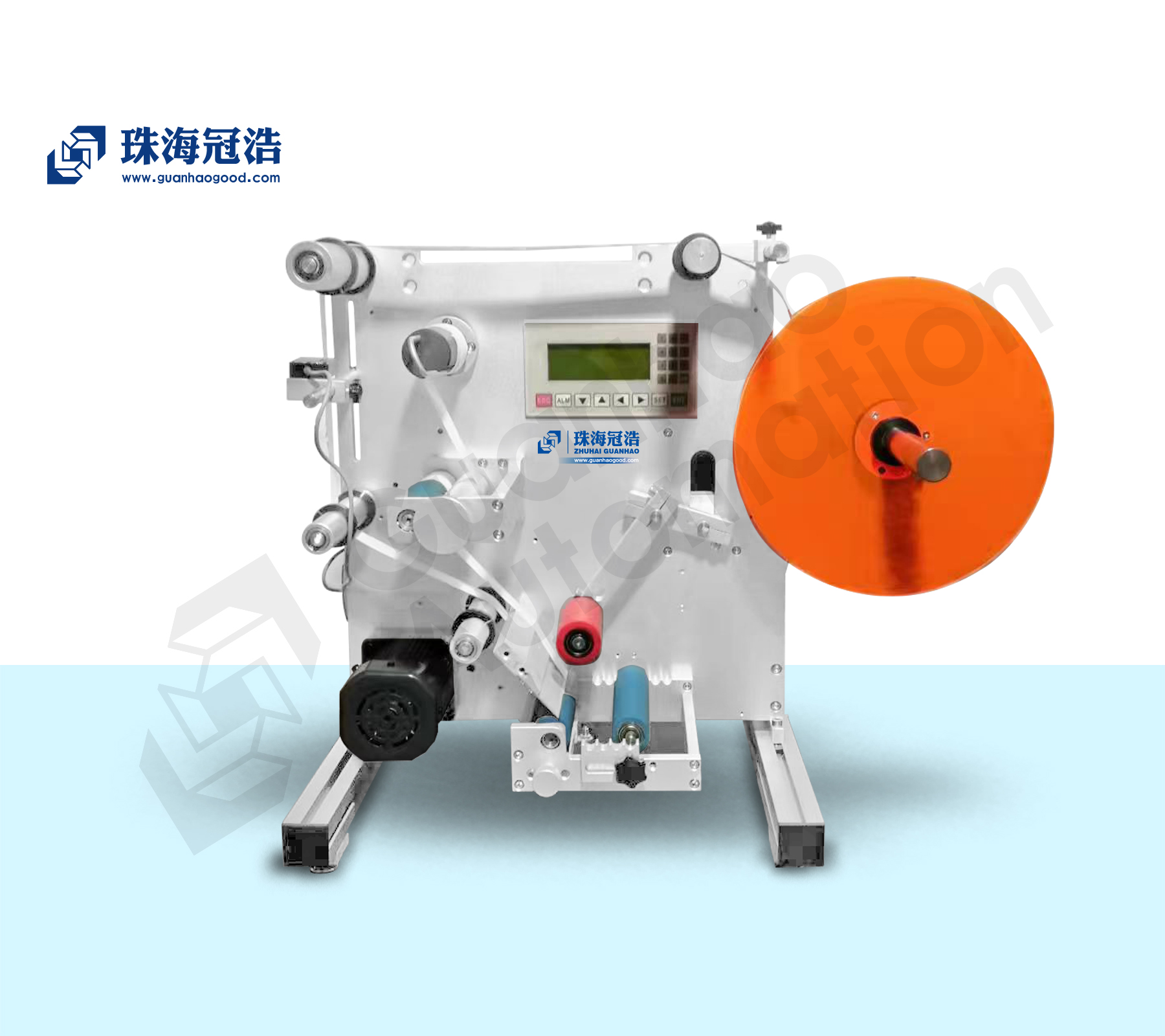 核心工作原理:传感器检测到产品到位或脚踩发出产品到位信号,在适当位置送出一张标签贴在产品预定位置上,产品转动中贴标和覆标,标签贴完并覆好在产品上,一张标签的贴附动作完成;