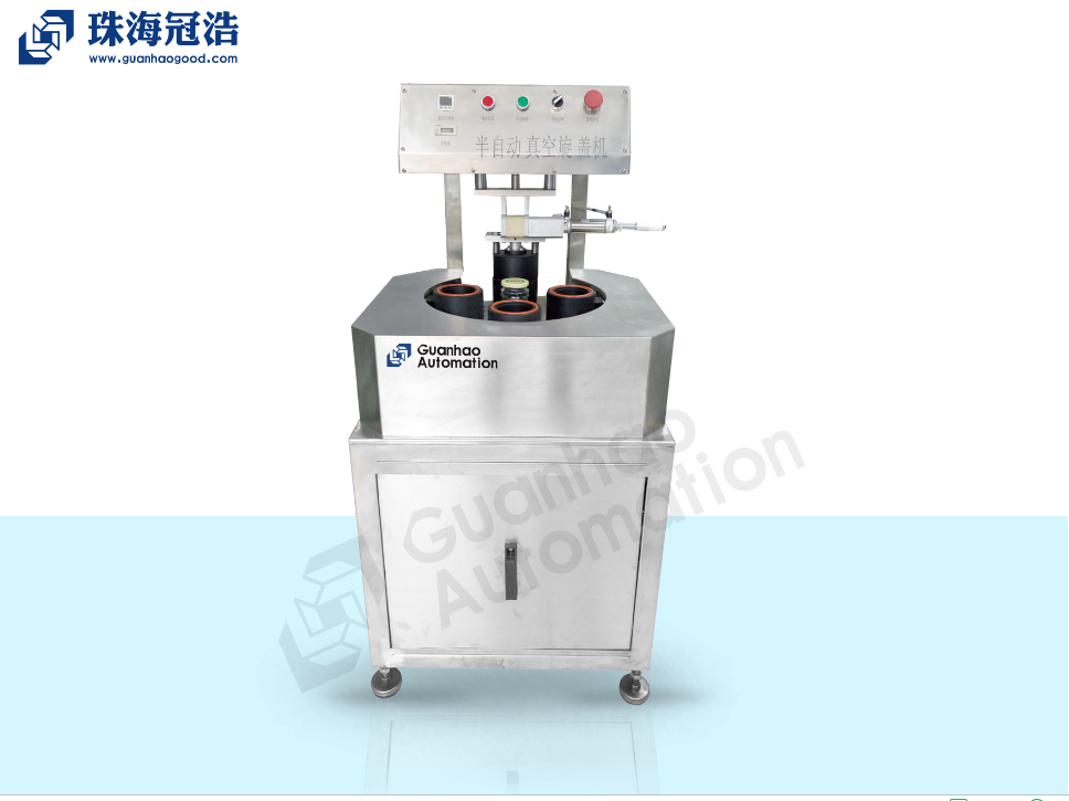 珠海冠浩机械半自动真空旋盖机 半自动抽真空旋盖机,采用机、电、气一体化设计,结构紧凑合理,操作维修方便。性能稳定可靠。广泛适用于食品饮料、调味品、保健品等行业中各种三(四)旋盖玻璃瓶的真空旋盖。