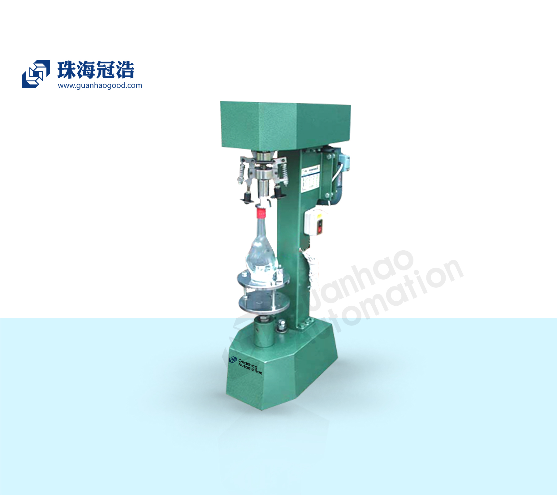 珠海冠浩机械-半自动锁盖机采用两刀封盖、体积小,更换部分零件可进行多种形式的封盖。加装玻璃护瓶罩,彻底解决了斜歪瓶的破损问题,价格便宜。