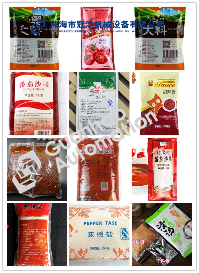 膏体、液体、酱类、包装机广泛应用于黄豆酱、辣椒酱、花生酱、芝麻酱、橄榄菜、麻辣酱等颗粒酱料的袋装灌装。